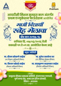 आयटीसी मिशन सूनहरा कल अंतर्गत प्रथम एज्युकेशन फाउंडेशनच्या वतीने सन २०१७–१८ बॅचच्या माजी विद्यार्थ्यांचा स्नेह मेळावा शनिवार, दिनांक ७ मार्च २०२६ रोजी सकाळी ११ ते दुपारी १ या वेळेत आयोजित करण्यात आला आहे. हा स्नेह मेळावा बाबुराव दौंडकर स्मारक समिती, रांजणगाव गणपती येथे उत्साहपूर्ण वातावरणात पार पडणार आहे.